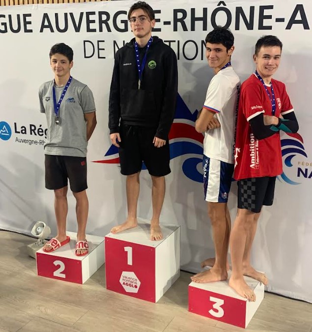 Raphaël rentre quand à lui avec 2 titres de champion de ligue Juniors Aura au 50 et 200 brasse en finale A (dommage qu’il n’ai pas pu participer au 100m, le triplé était envisageable!), il améliore également ses deux autres courses : 200 nage libre et 200 4nages (finale B). Félicitations à lui et de bonne augure pour les championnats de France Juniors auxquels il participera la semaine prochaine.
