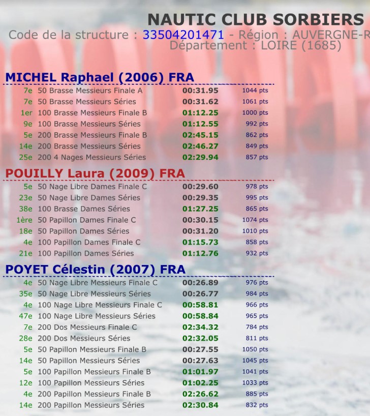 6 MPP, 3 finales B et 3 finales C, une 1ère place juniors 1/2 au 50 papillon, 3eme place au 100 papillon.